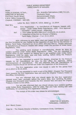 Anandha Fabrications (CBE) Pvt. Ltd. is an engineering and manufacturing firm that provides custom pressure vessels for Industrial and Commercial uses. We can provide pressure vessels up to 25Kg/cm2 pressure rating, 30 Tonnes in weight, size up to 4000 mm (O/D), 50 mm (C.S.)/25 mm (S.S.) (thickness) & 6000 mm (length) and in Carbon Steel, Stainless Steel & Alloy Steel. Using latest manufacturing techniques, materials and skills, Pressure Vessels are manufactured. Inter-process QA inspections ensure high quality levels are maintained. Hydraulic, Radiographic, Magnetic Particle, Dye Penetrant testing, as required, can be performed. Certification of pressure vessels can be supplied for pressure test, weld tests, materials, pressure gauges and relief valves etc. upon your request.